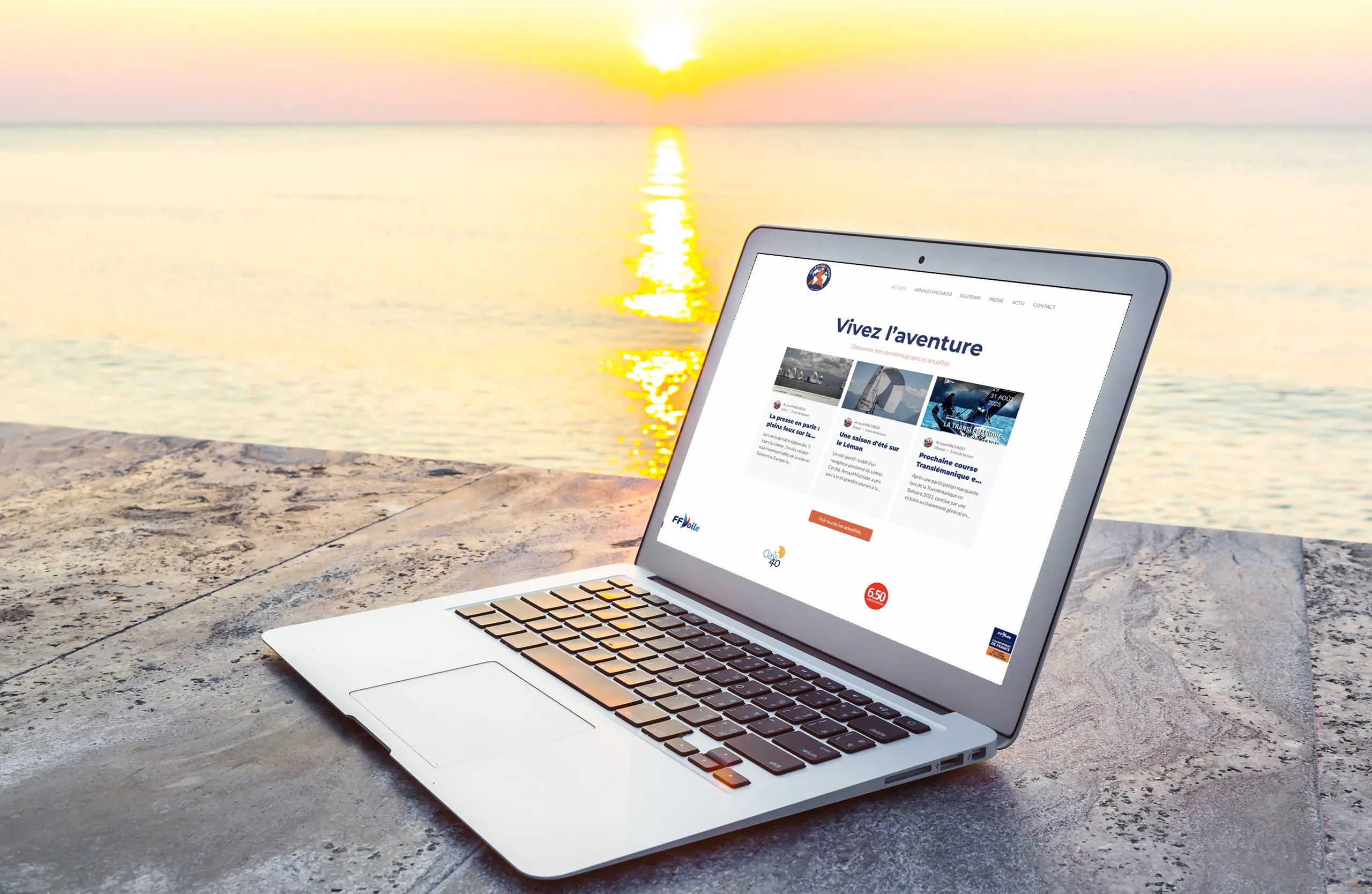 Son site internet a récemment fait l’objet d’une refonte complète sur Wix, pensée pour valoriser son univers. Le design, sobre et épuré, met en avant ses aventures tout en offrant une navigation fluide et moderne. L’identité visuelle a été retravaillée pour refléter sa personnalité : entre force tranquille et passion du large.
